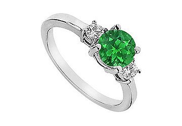 A brilliant-cut, round emerald is prong-set in the center & is accented by two round diamonds. Made in 14K white gold, this engagement ring has a total gem weight (TGW) of 1.25 ct.